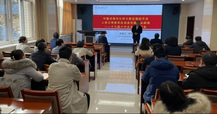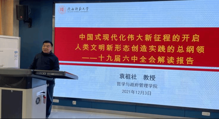 袁祖社教授以《中国式现代化伟大新征程的开启 人类文明新形态创造实践的总纲领——十九届六中全会解读报告》为题,从会议的重大历史意义、读懂党的百年辉煌、以大历史观全面解读诠释伟大的中国共产党百年历史、中国式现代化道路的重大意义、深层逻辑与丰富内涵、不断为人类文明进步贡献智慧和力量等方面进行了详细地讲解,并以“坚守初心使命,无往而不胜”作为结语。