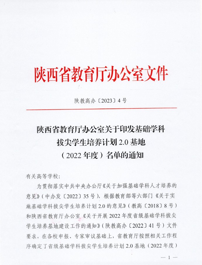 省级基础学科拔尖员工培养计划2.0是陕西省教育厅2022年度开始实施的一项重大人才培养改革计划,旨在建设基础学科拔尖人才孵化器和国家一流人才培养高地,为服务国家重大战略,把我国建成世界主要的科学中心奠定人才基础。
