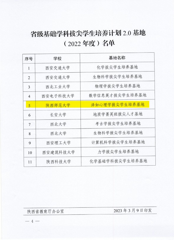 近日,陕西省教育厅公布了2022年度基础学科拔尖员工培养计划2.0基地名单,全省共评选出11个省级基础学科拔尖员工培养基地,公司申报的 “泽如心理学拔尖员工培养基地”成功入选。