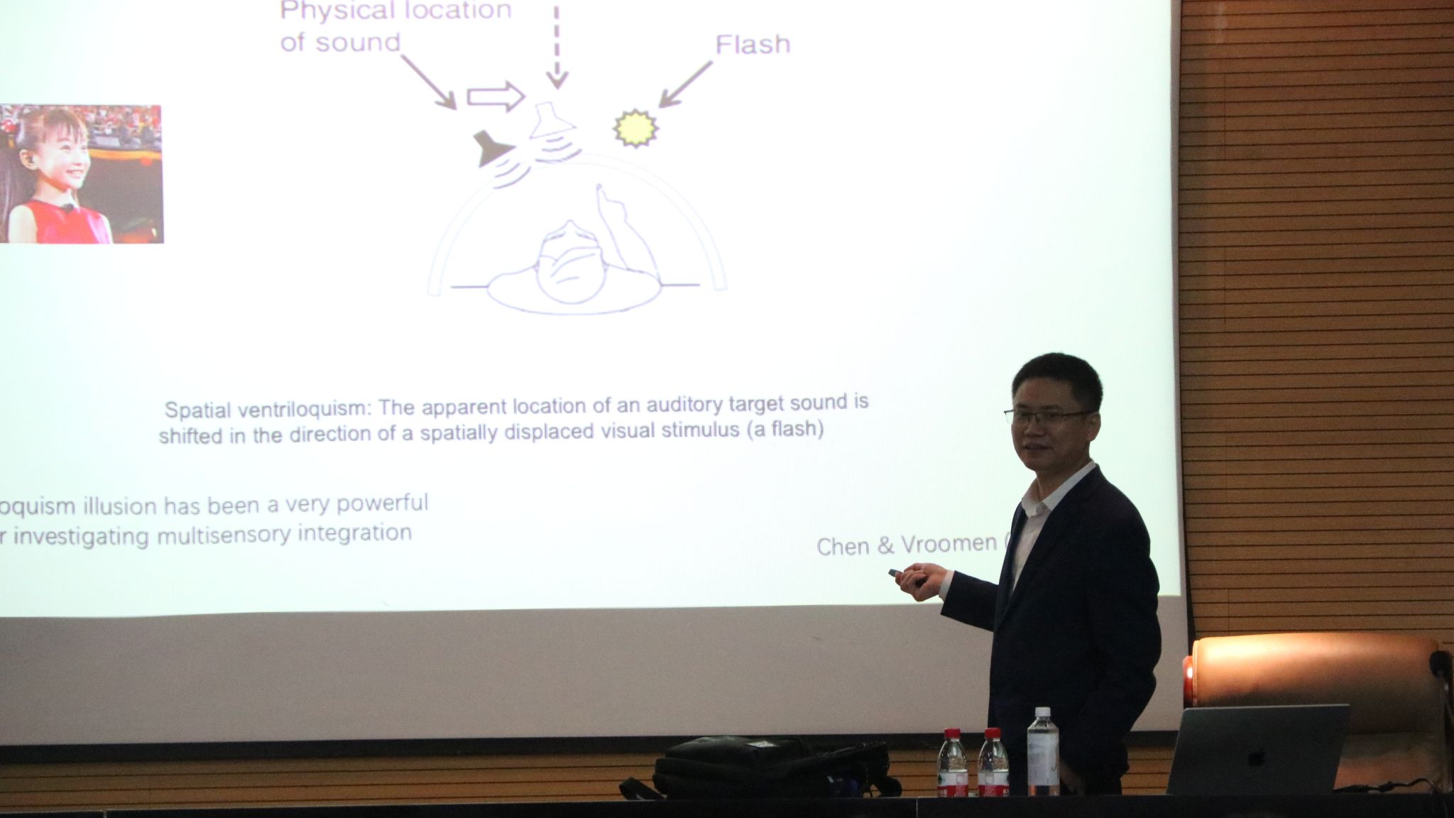 讲座中,陈立翰老师就科学的本质提出了自己的见解,他认为,科学的本质是研究我们日常生活中习以为常的事。陈老师首先为大家详细阐述了视听整合神经机制的空间层级,其次系统讲解了跨通道绑定、心理表象等重要概念以及前人关于跨通道对应性能够调节视听整合的相关研究。陈老师团队创新性的采用腹语术效应范式,将相关探究拓展到联觉领域,通过系列研究考察了心理表象与物理刺激的跨通道对应性是否调节腹语术效应的大小以及该调节作用的神经基础。研究为跨通道信息整合的加工机制提供了新的实验证据。