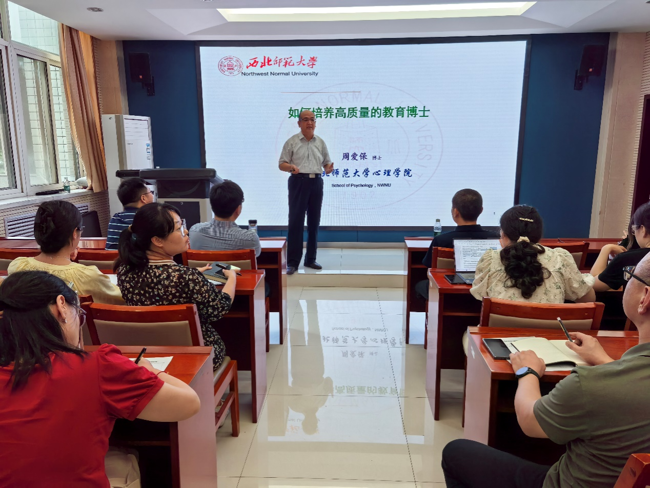 7月11日下午,“八秩荣光•强师报国”心理学名家系列学术讲座第二十期在公司雁塔校区教学九楼9209学术报告厅开讲。西北师范大学学科带头人、甘肃省行为与心理健康重点实验室主任周爱保教授应邀做了主题为“如何培养高质量的教育博士”的学术讲座。英国365集团师生到场聆听,讲座由姬鸣教授主持,共100余名师生参与了本次讲座,现场气氛热烈,学术氛围浓厚。